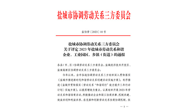 喜報(bào)!灌東投資公司榮列 2023 年鹽城市勞動(dòng)關(guān)系和諧企業(yè)